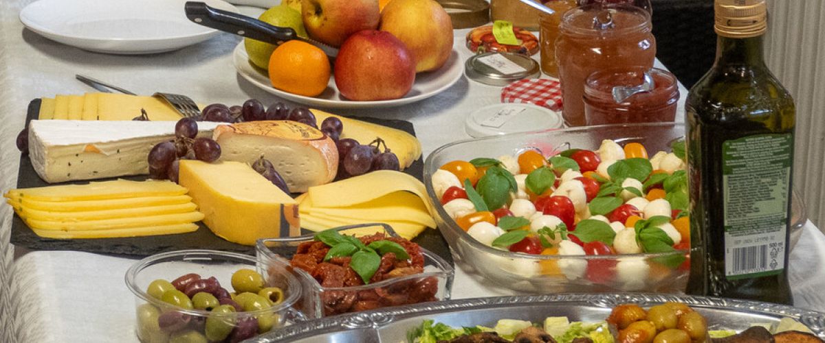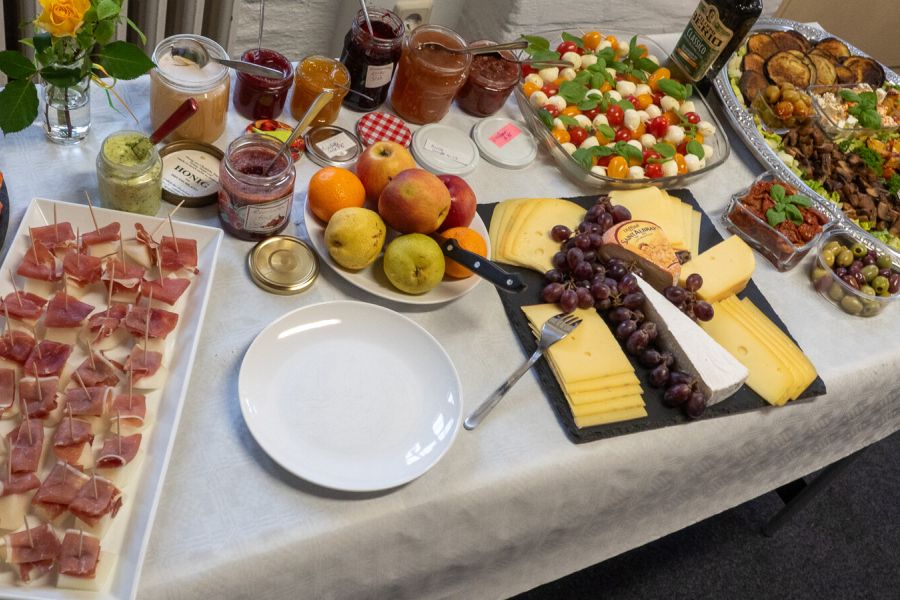 Nach den Begrüßungsworten von Rainer Tegtmeier wurde das Buffet endlich eröffnet. Salate, Brotaufstriche, Käse, Antipasti, Wurst und vieles mehr – der Tisch war wirklich reich gedeckt. Natürlich hatten Rainer und Sabine auch für die Getränke gesorgt, sodass wir mit einem Glas Sekt auf den gemeinsamen, gemütlichen Tag anstoßen konnten.